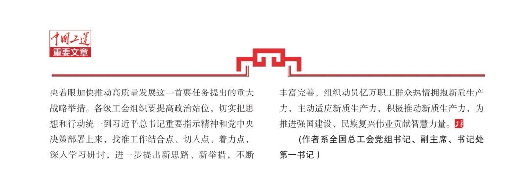 發(fā)展新質生產(chǎn)力,是以習近平同志為核心的黨中央著眼加快推動高質量發(fā)展這一首要任務提出的重大戰(zhàn)略舉措。各級工會組織要提高政治站位,切實把思想和行動統(tǒng)一到習近平總書記重要指示精神和黨中央決策部署上來,找準工作結合點、切入點、著力點,深入學習研討,進一步提出新思路、新舉措,不斷豐富完善,組織動員億萬職工群眾熱情擁抱新質生產(chǎn)力,主動適應新質生產(chǎn)力,積極推動新質生產(chǎn)力,為推進強國建設、民族復興偉業(yè)貢獻智慧力量。